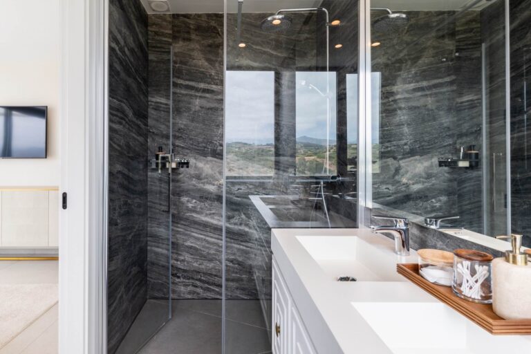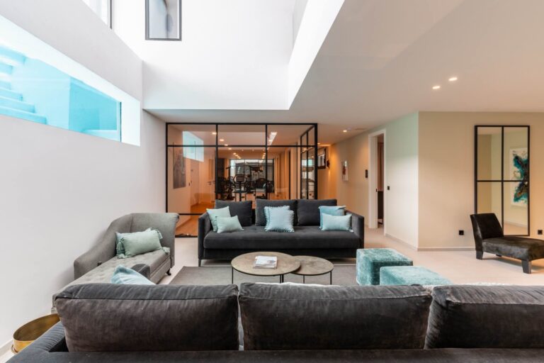 The villa offers 9 bedrooms in total: 8 with en-suite bathrooms—6 on the first floor (all with private terraces) and 2 in the basement. There’s also an additional bedroom on the top floor with access to the rooftop terrace, but without an en-suite bathroom. Its high ceilings and large windows flood the interiors with natural light, creating a seamless flow between indoor and outdoor spaces.